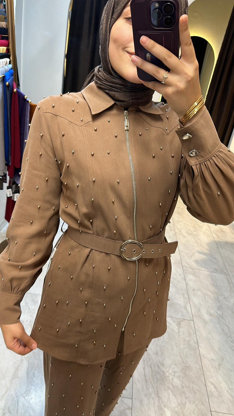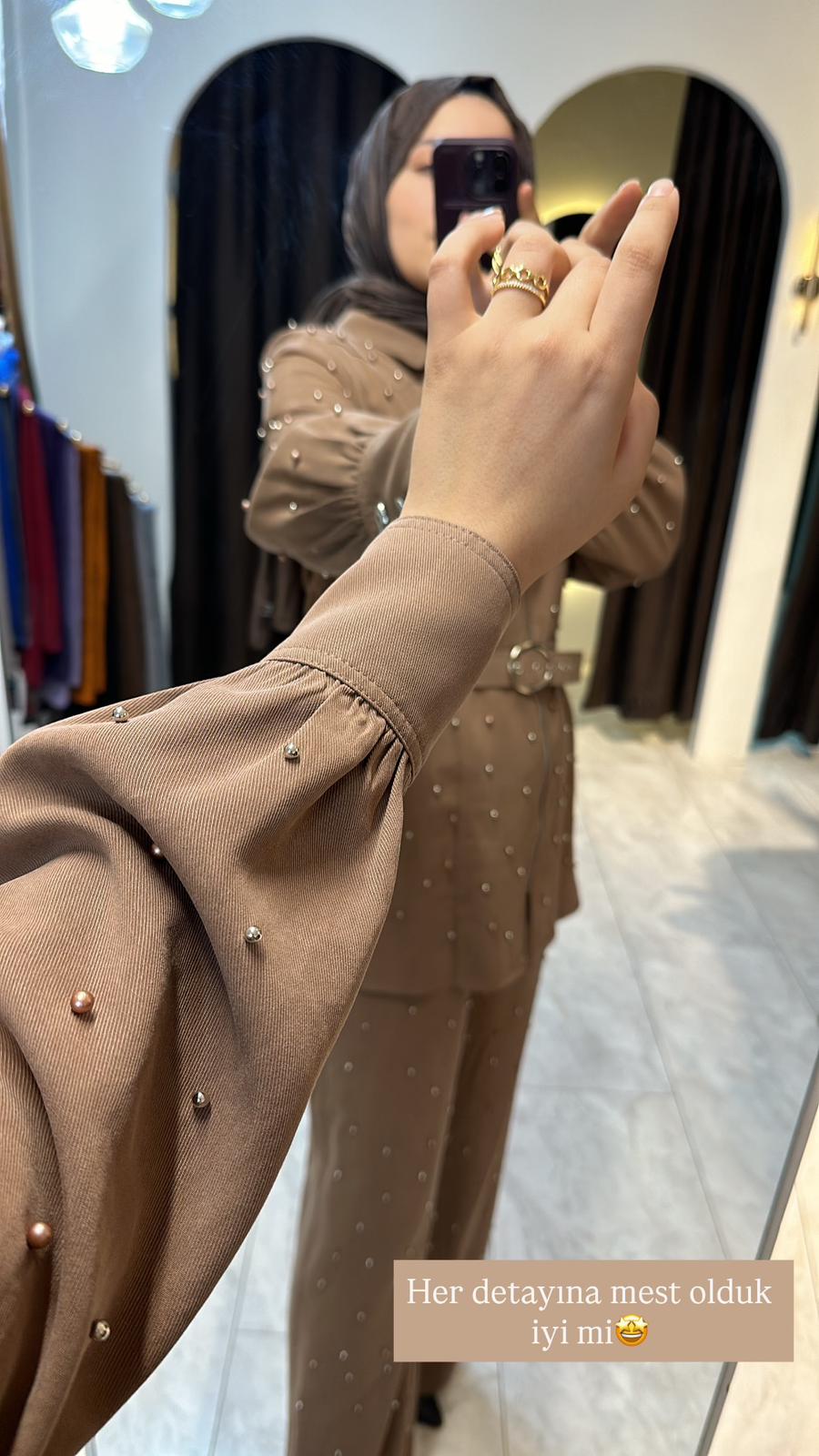TAŞ İŞLEME TASARIM KUPRA PANTOLONLU TAKIM